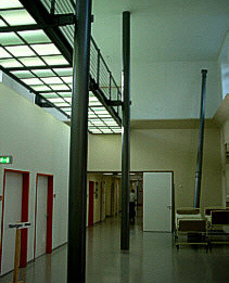 | Bauherr: Ruppiner Kliniken GmbH Fehrbelliner Str. 38 16816 Neuruppin Ansprechpartner: H. Schütt Tel. 03391 / 39 46 1 Architekt: Planungsring Dr. Pawlik & Co Generalplanungsgesellschaft mbH Hohenzollerndamm 125/126 14199 Berlin www.planungsring.com Bauzeit: 2002 - 2006 Gesamtbaukosten: 25.000.000 € Honorarzone: III unten Ausgeführte Leistungsphasen: HOAI, § 64, LP 1 bis LP 6 und bauphysikalische Nachweise (EnEV, Brand- und Schallschutz) Bauart Haus X: Neubau Bettenhaus und Funktionstrakt (OP-Bereich und Intensivstation) in Stahlbetonmassivbauweise bestehend aus KG, EG und zwei Obergeschossen, Geschossdecken als Flachdecken, Stützenraster 7,50 x 7,50 m, KG Außenwände und Sohle in WU-Beton, aussteifende Treppenhaus- und Aufzugskerne, Außenwände ab EG mit 11,5 cm Klinkervorsatzschale, Stahlbetonflachdächer, Plattengründung, Verbindungsgänge im KG und 1.OG zu den Altbauten Haus C und Haus M. Bauart Haus Z: denkmalgeschütztes ehemaliges Küchengebäude, Mauerwerksbau mit Klinkerfassade, Massivdecken (Stahlstein- bzw. in Teilen Stahlbetondecken), Holzdachkonstruktion Umbaumaßnahmen in allen Geschossen für geänderte Nutzung. |